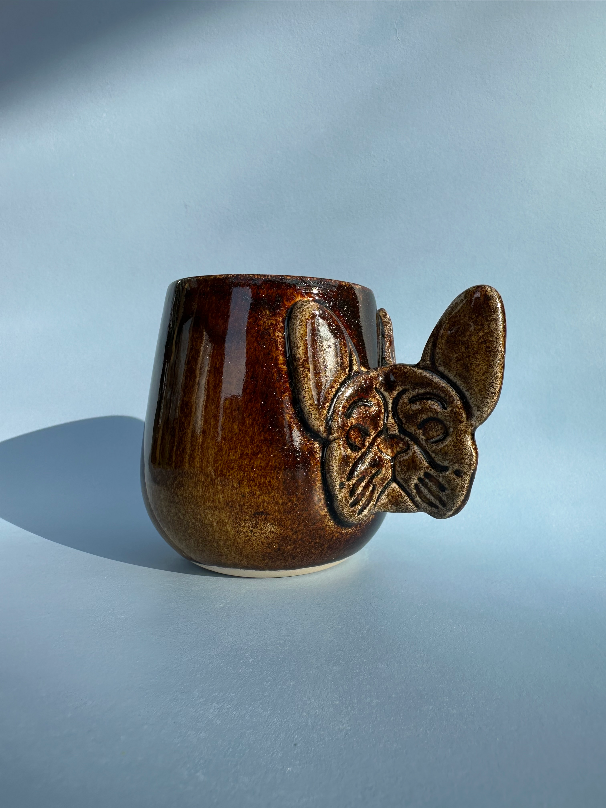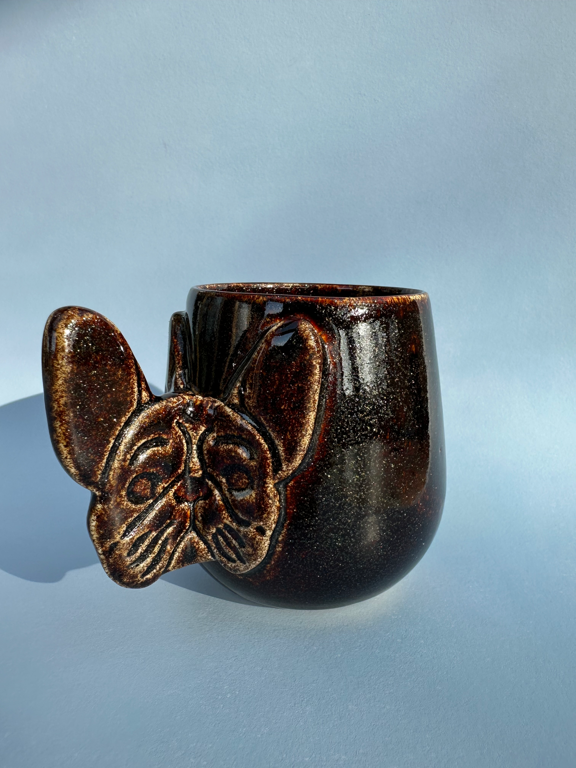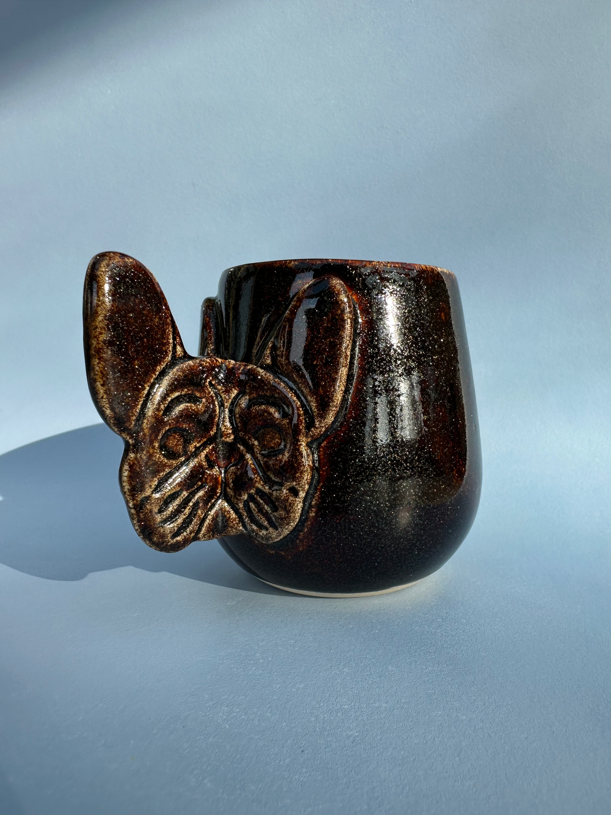 Hanken der har form som et fransk bulldogs hoved, danner et lækkert håndtag. Den håndværksmæssige tilgang giver hvert produkt sin egen karakter, fra hundens små detaljer til den individuelle glasur, der kan variere en smule på hver kop. Resultatet er et stykke keramik, der både er funktionelt og kunstnerisk. Perfekt til dig, der ønsker en personlig og anderledes kop.