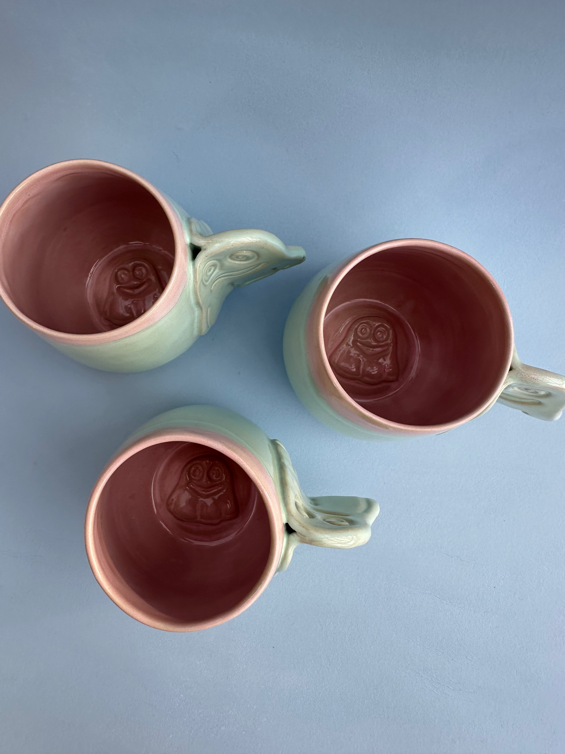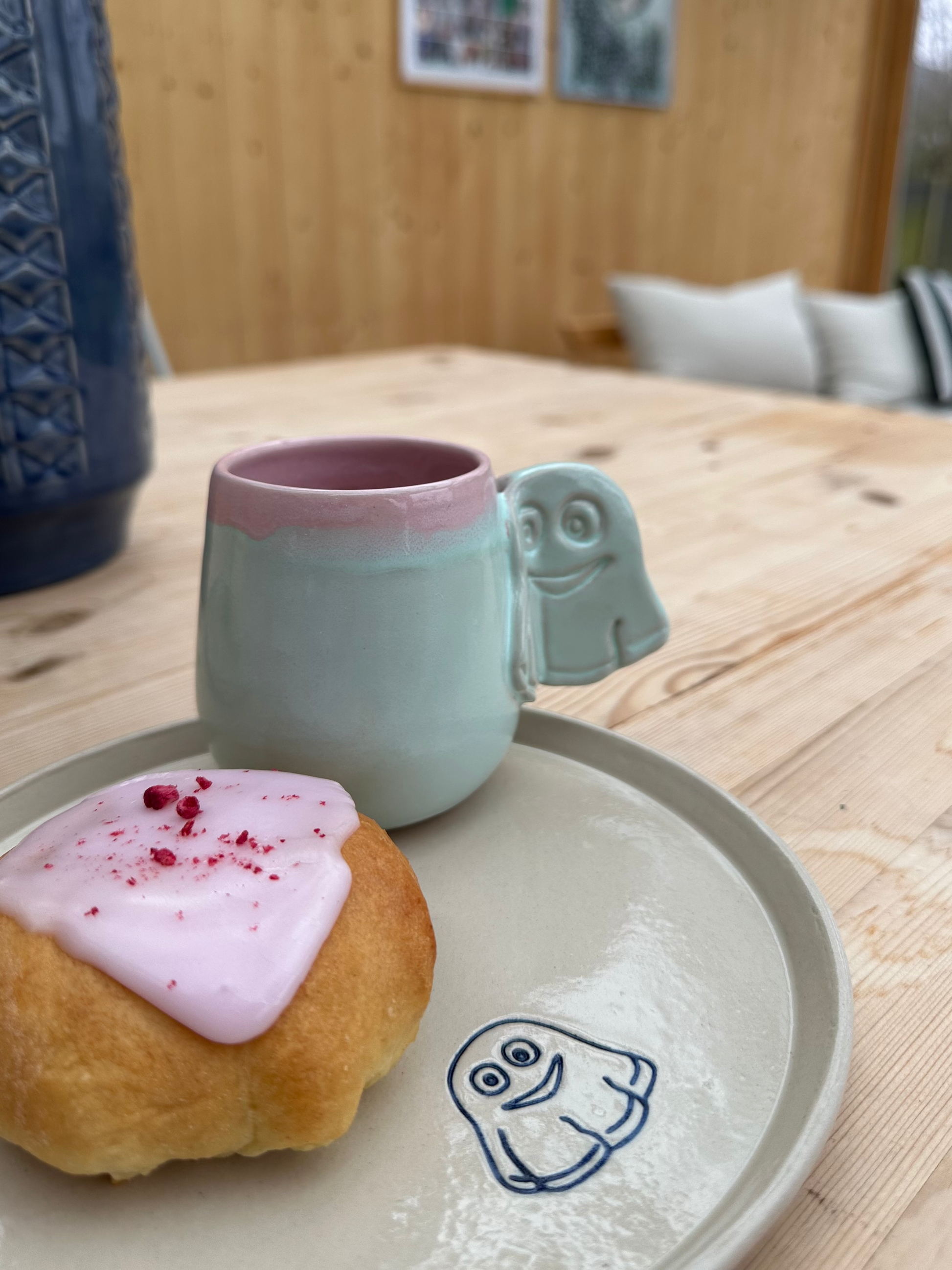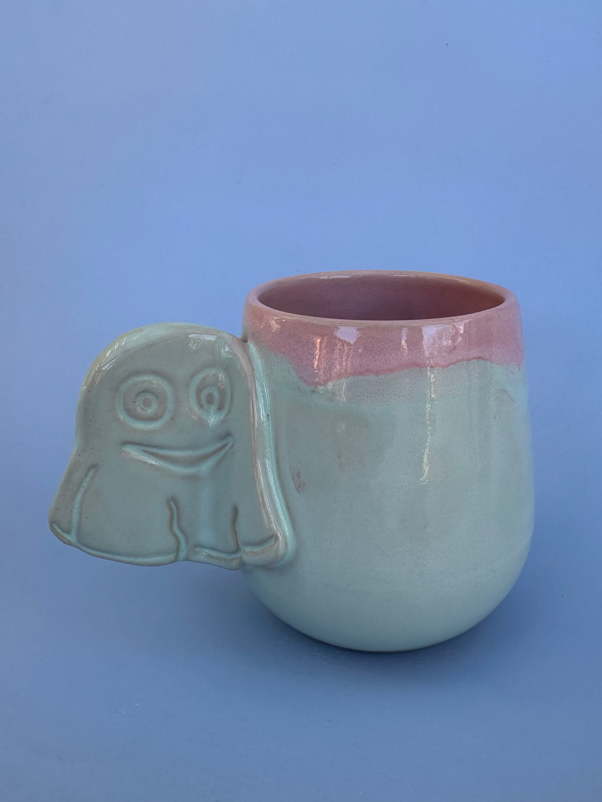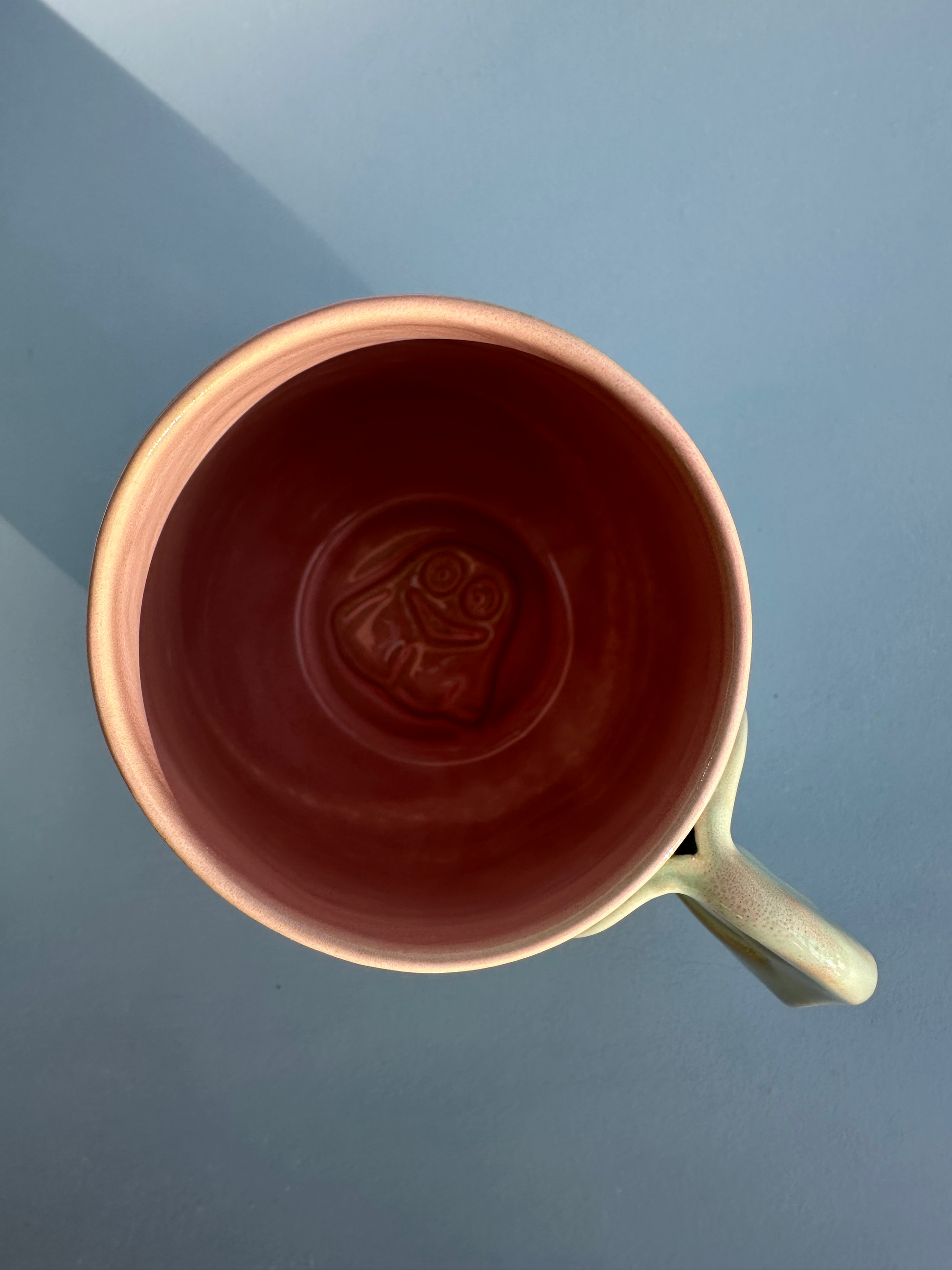 En smuk keramikkop i en blød afrundet form, der ligger godt i hånden. Yderst er koppen dækket af en mintgrøn glasur, der giver et roligt og elegant udtryk. Indeni og på kanten af koppen, findes en lyserød glasur, som skaber en fin kontrast og i bunden af koppen overrasker en lille kajkage.