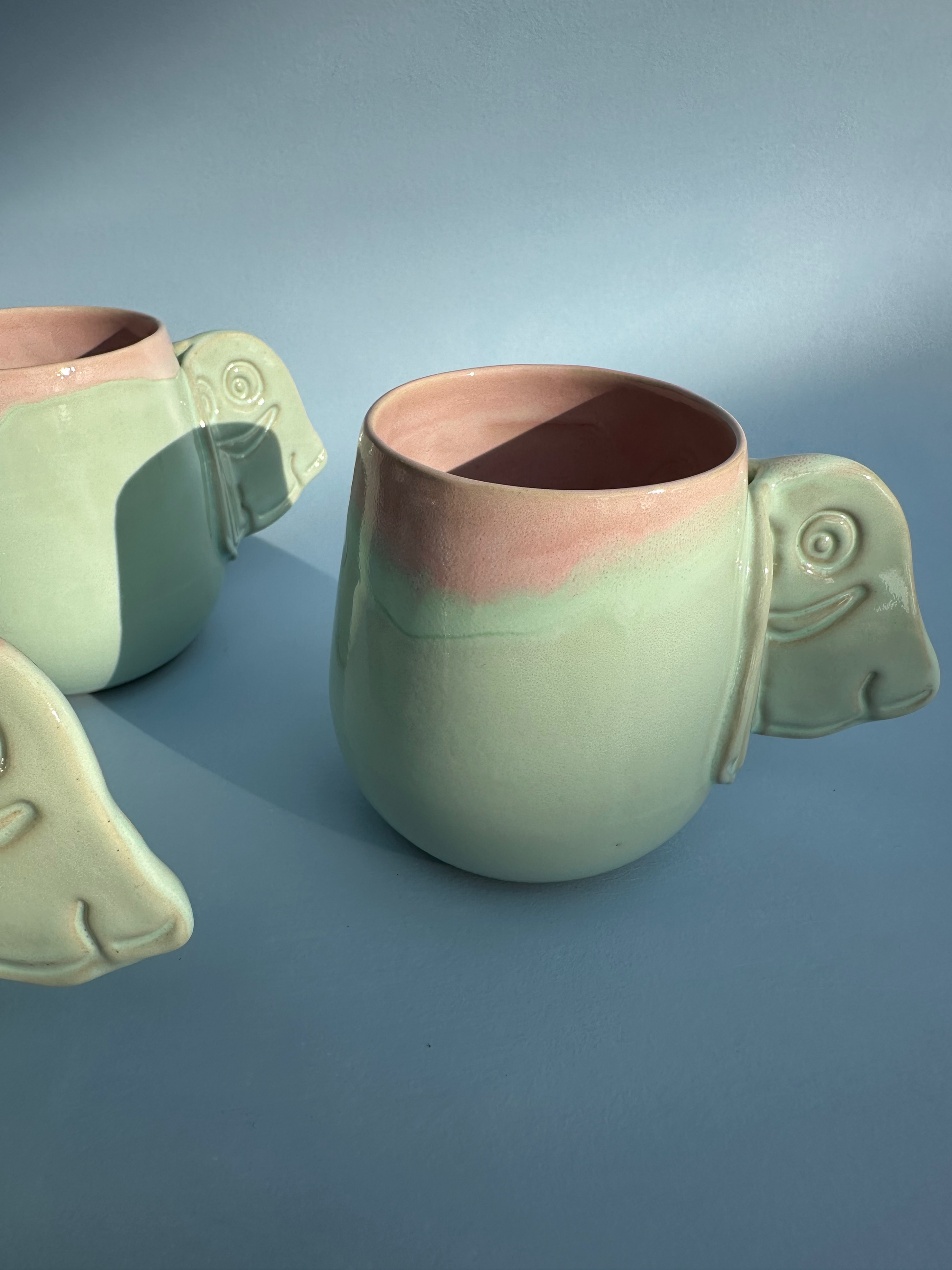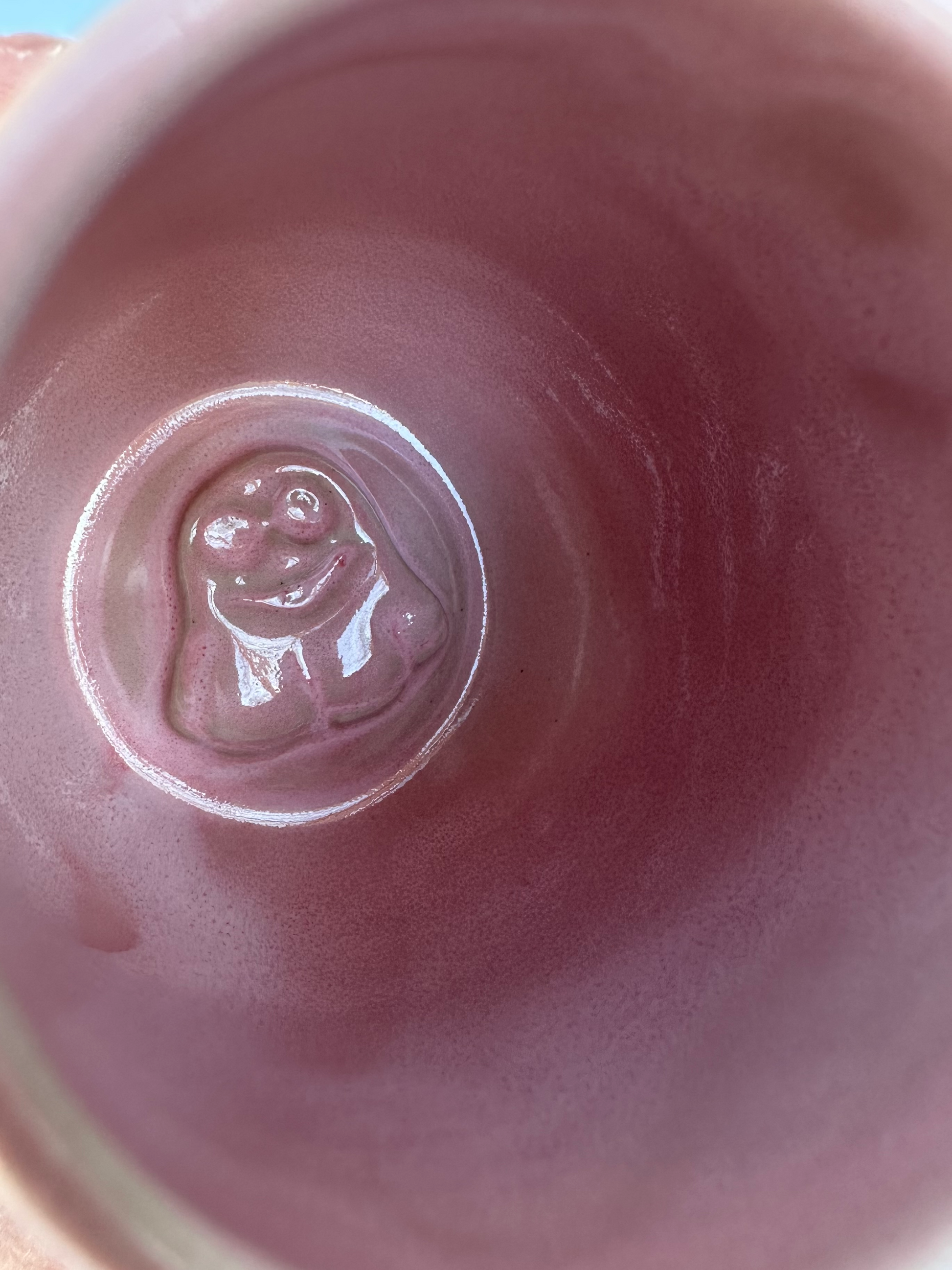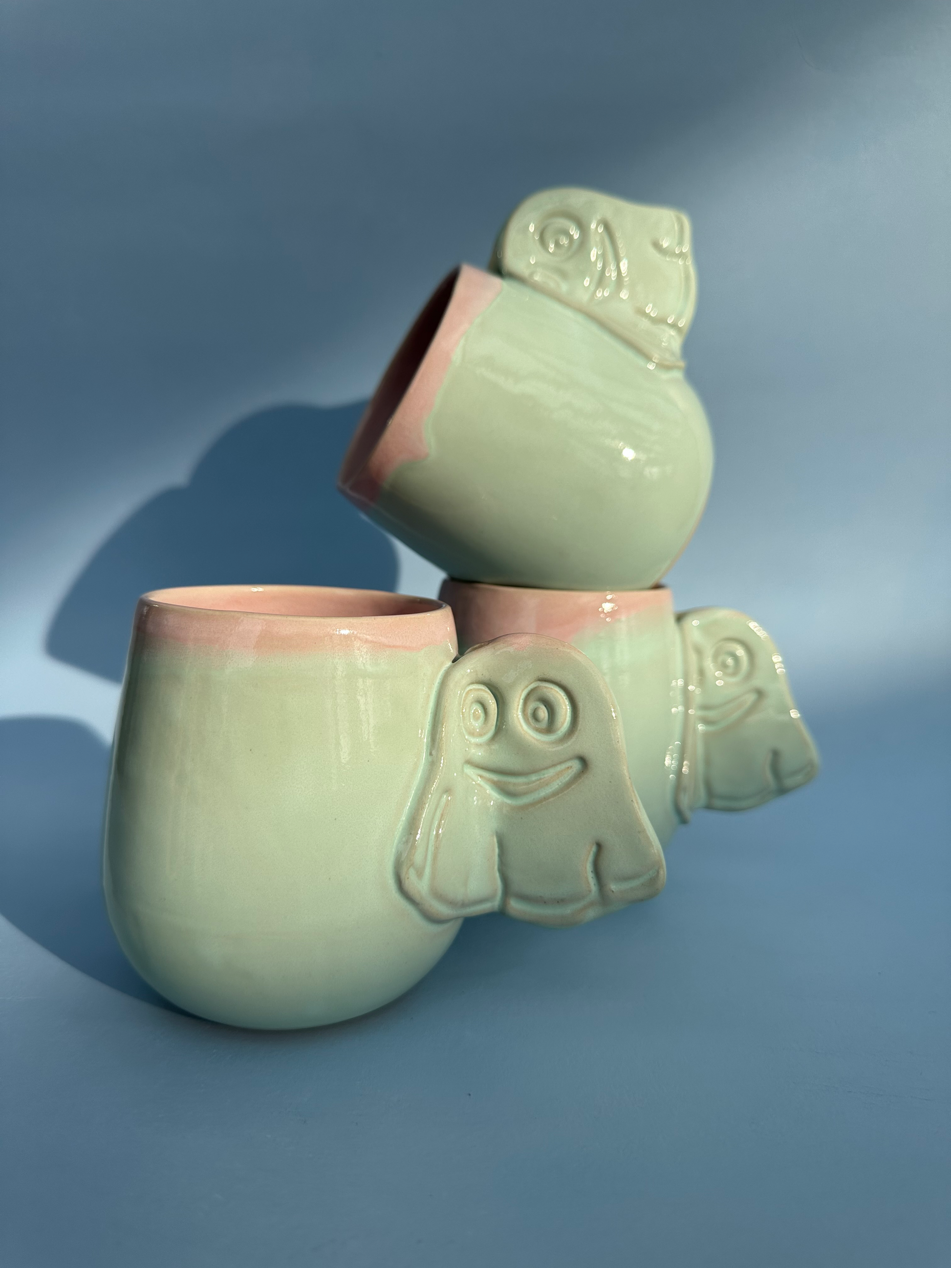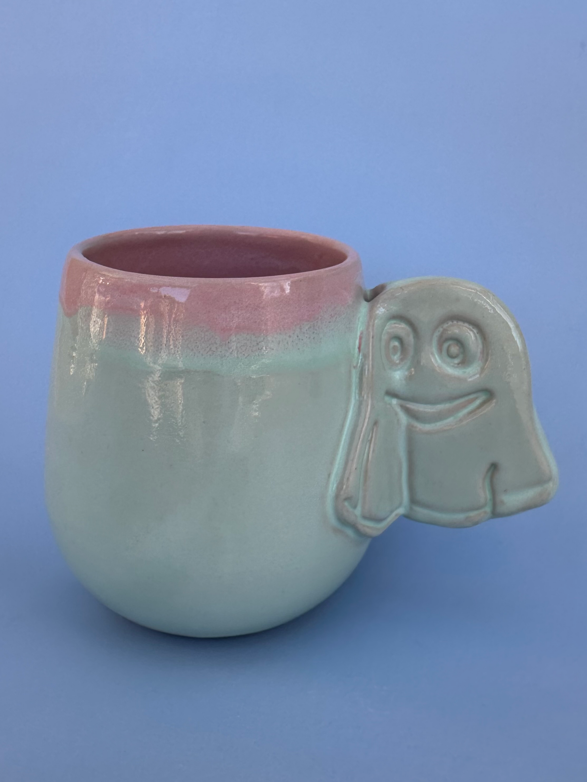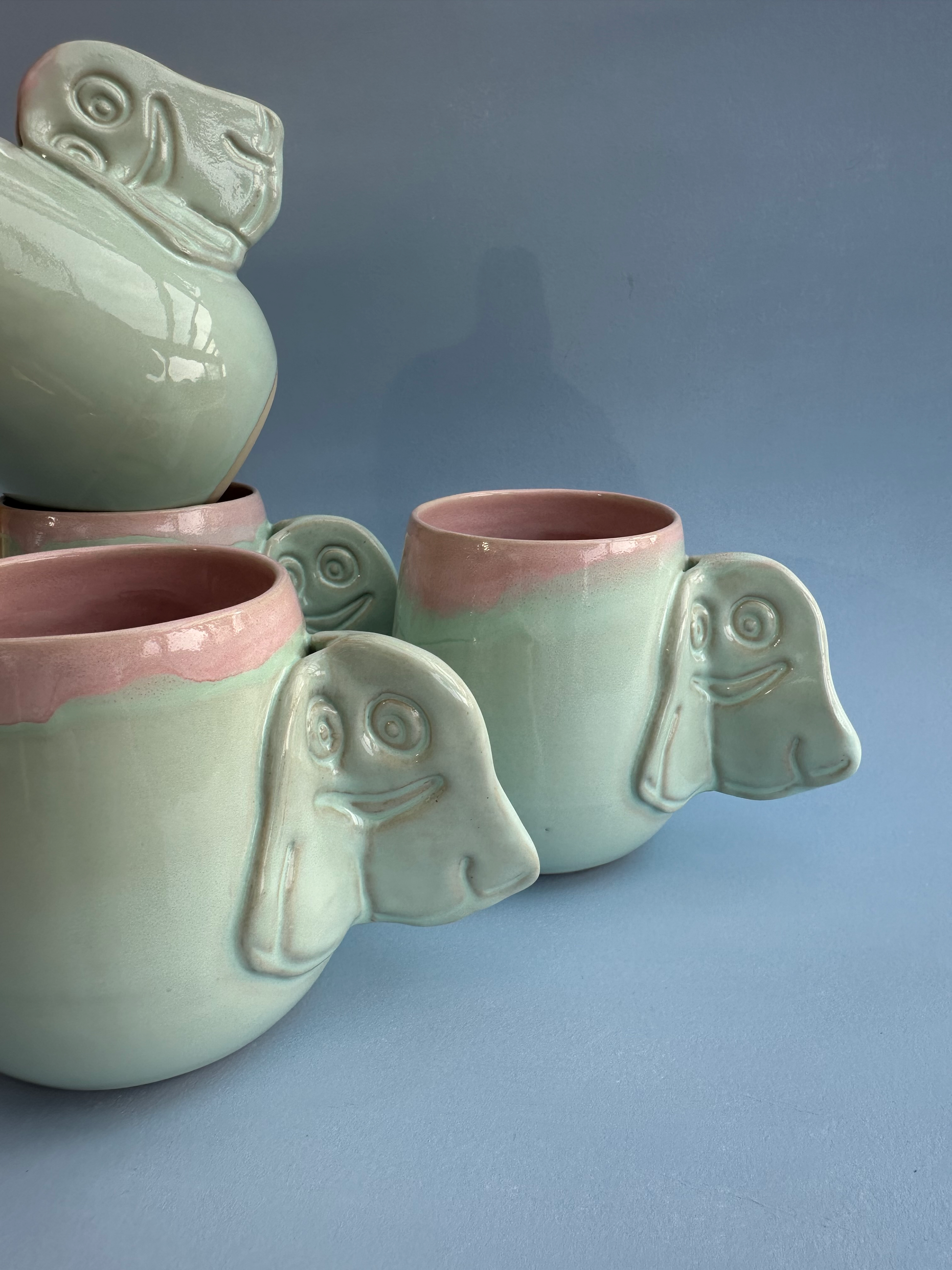 En smuk keramikkop i en blød afrundet form, der ligger godt i hånden. Yderst er koppen dækket af en mintgrøn glasur, der giver et roligt og elegant udtryk. Indeni og på kanten af koppen, findes en lyserød glasur, som skaber en fin kontrast og i bunden af koppen overrasker en lille kajkage.