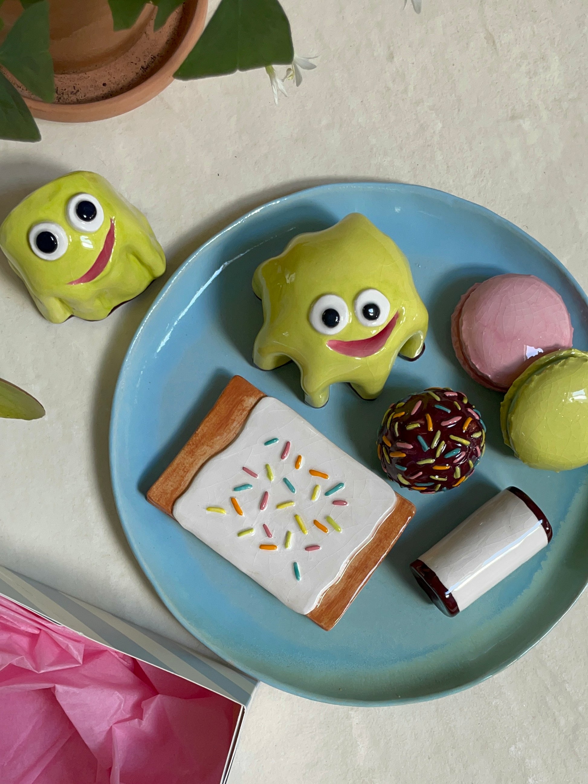 Hver enkelt kage er håndformet i lertøjsler og glaseret i hånden med omhu. Derfor kan nogle kager afvige lidt fra billederne. Kagerne vil have forskellige udtryk i form, krymmel og glasur, som er en del af æstetikken af det håndlavede udtryk. Hver kage er helt unik.