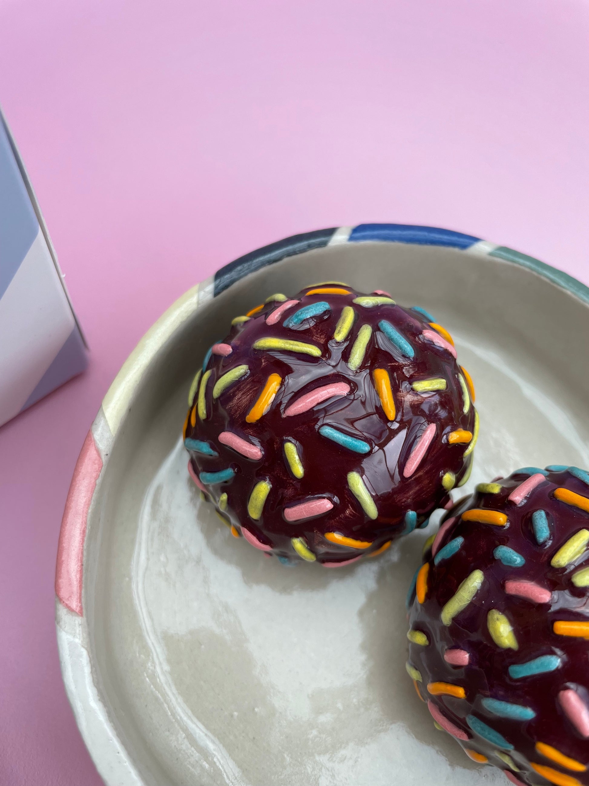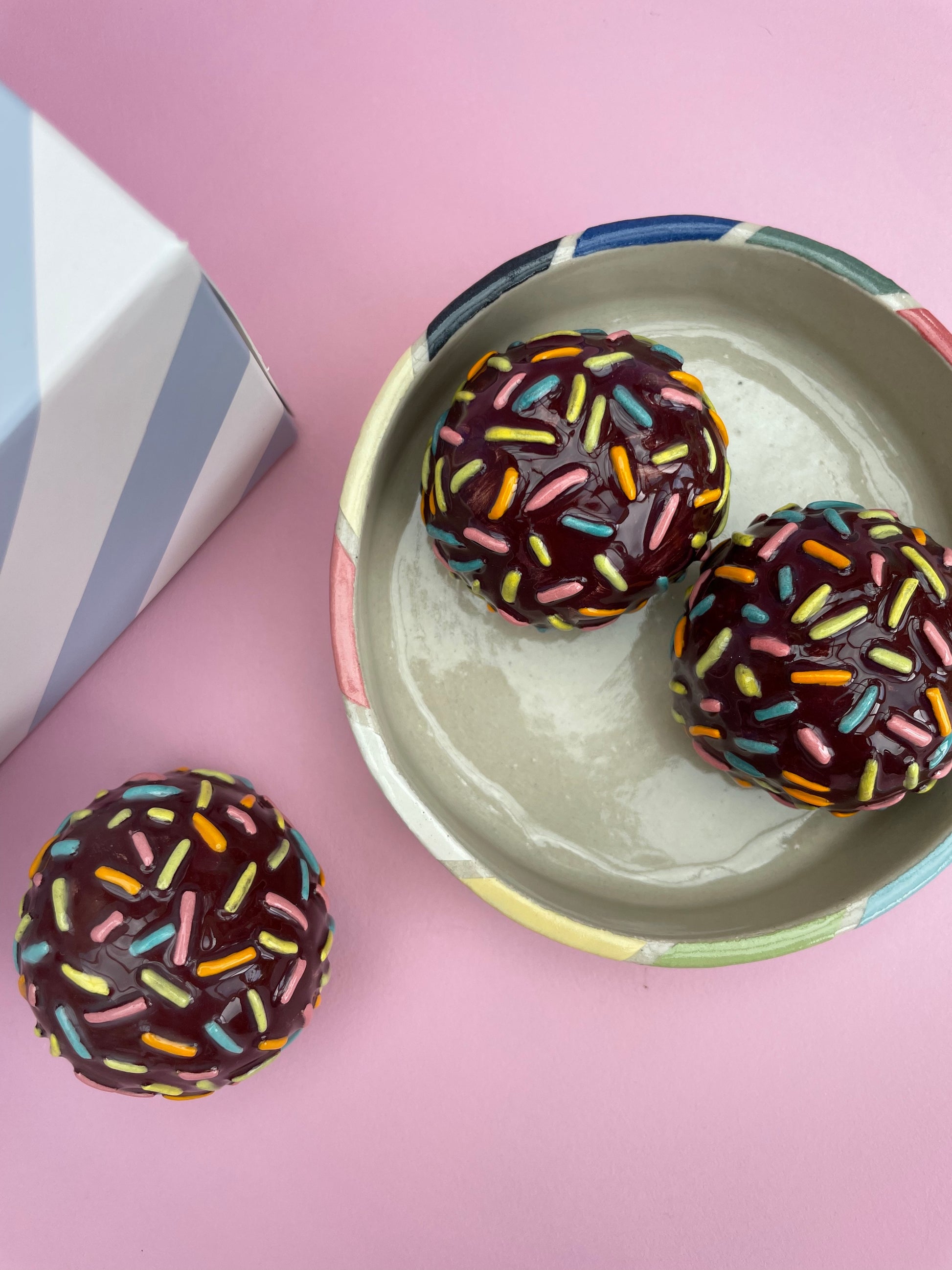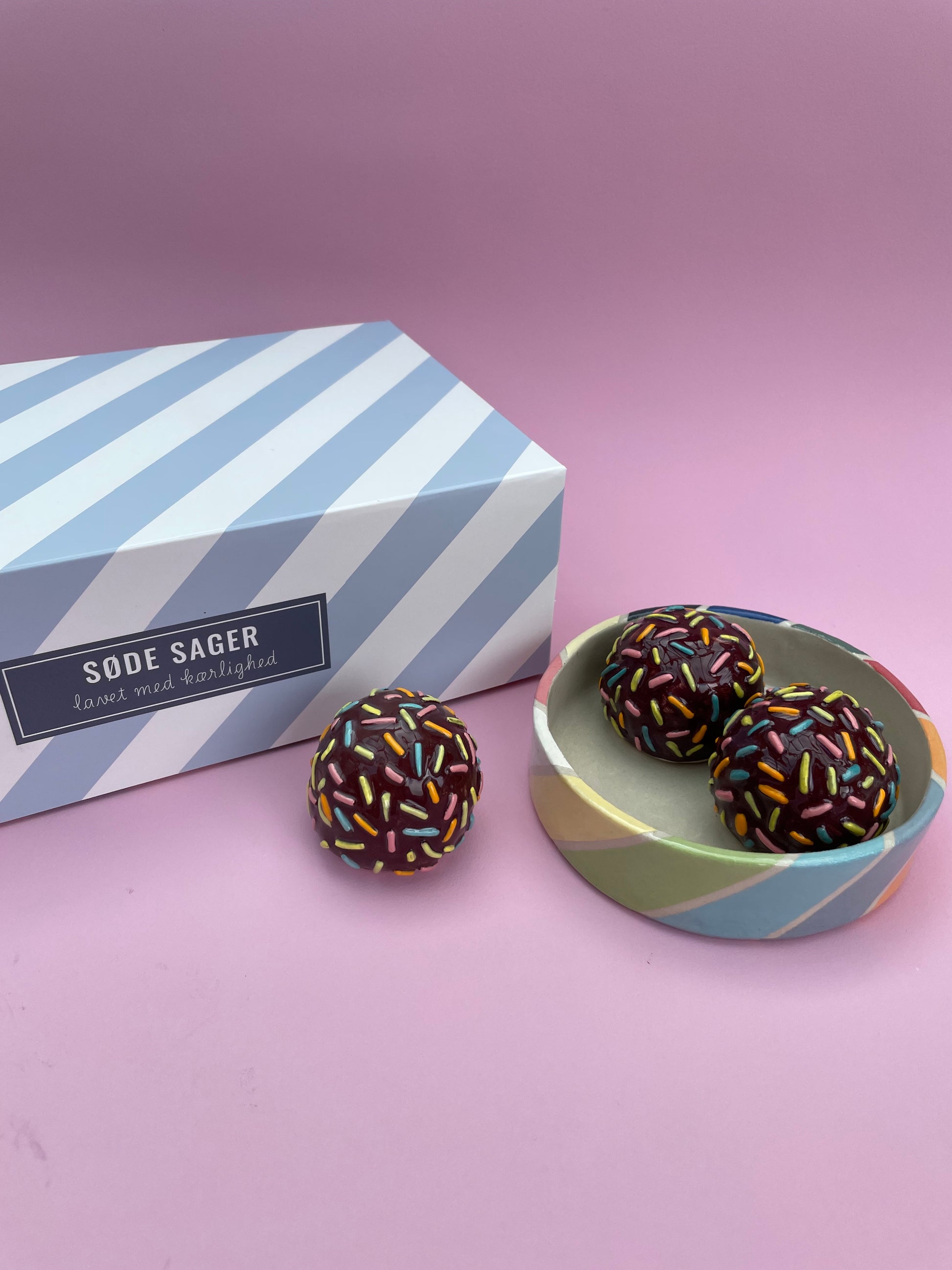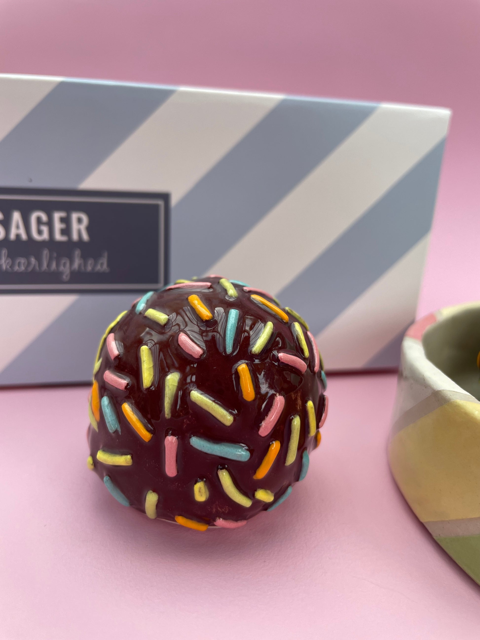 En lækker trøffel/romkugle med tivolikrymmel. Der er hul under bunden, så kagen kan hænges på væggen, hvis dette ønskes.