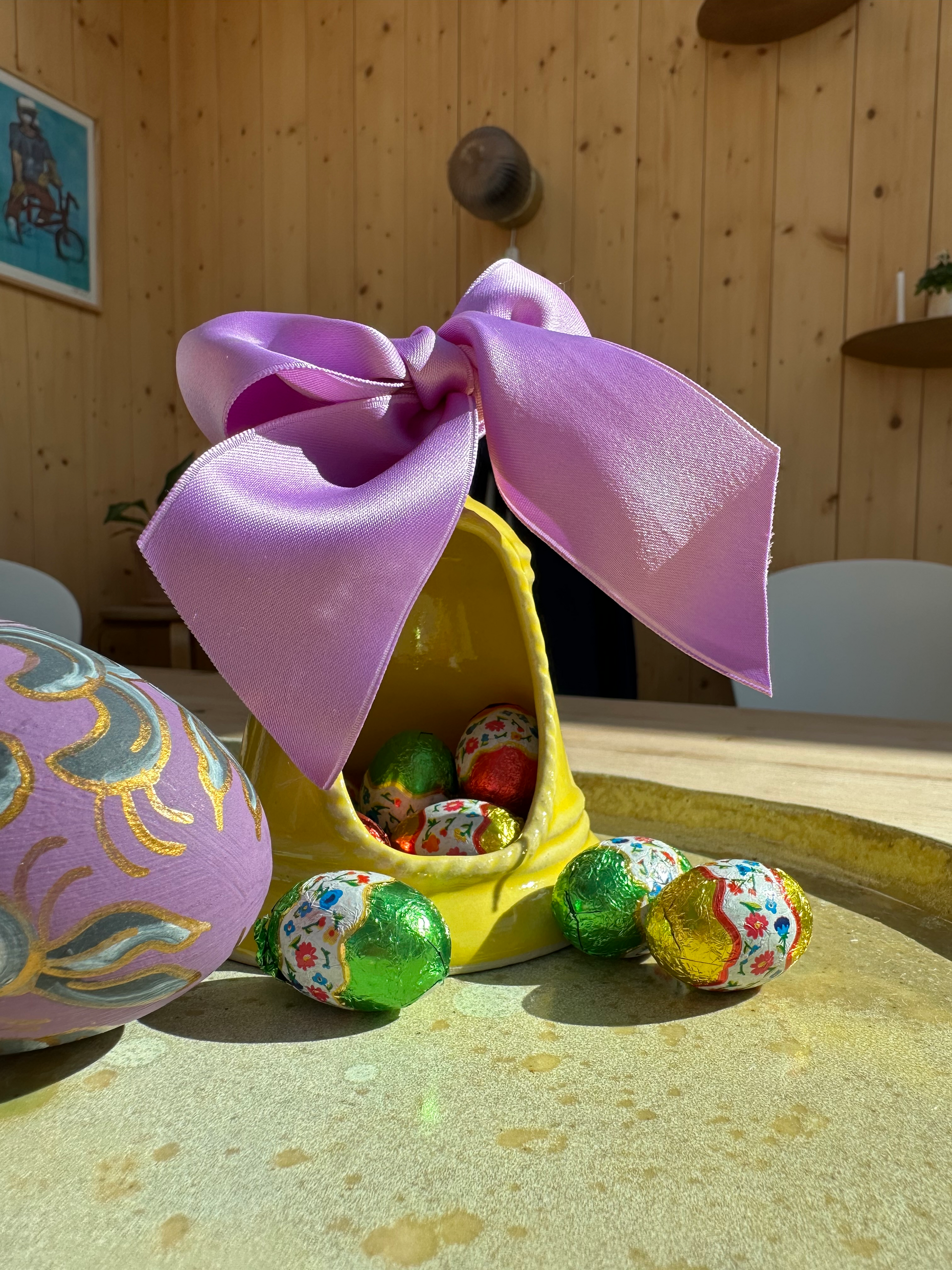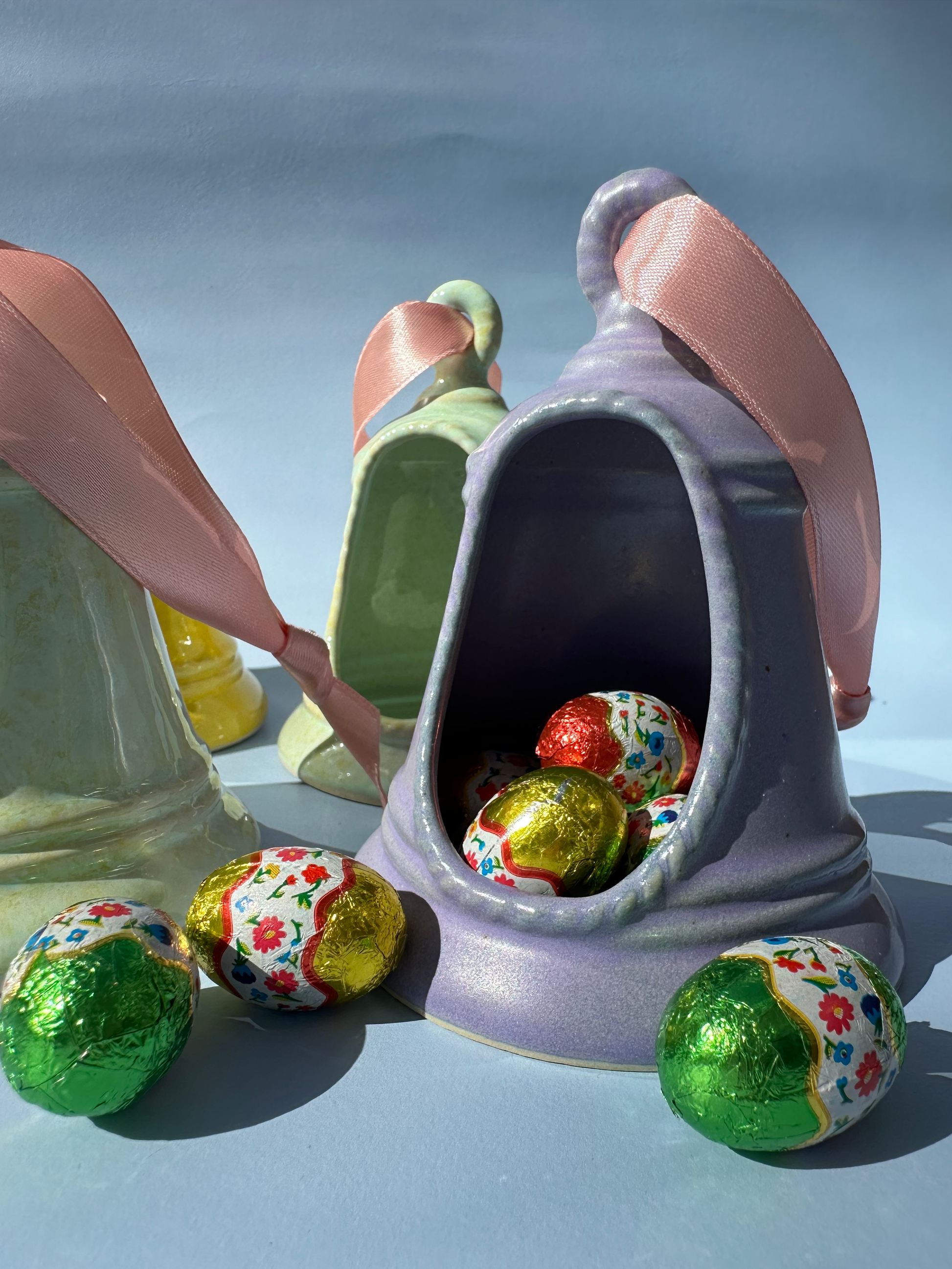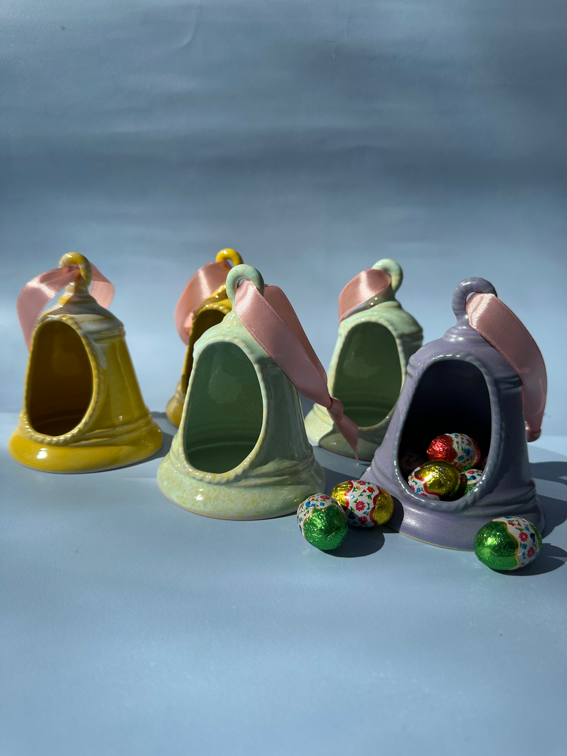 Sød klokke med satinbånd. Klokken kan hænges op, men kan også bruges på bordet til en lille sød snack.