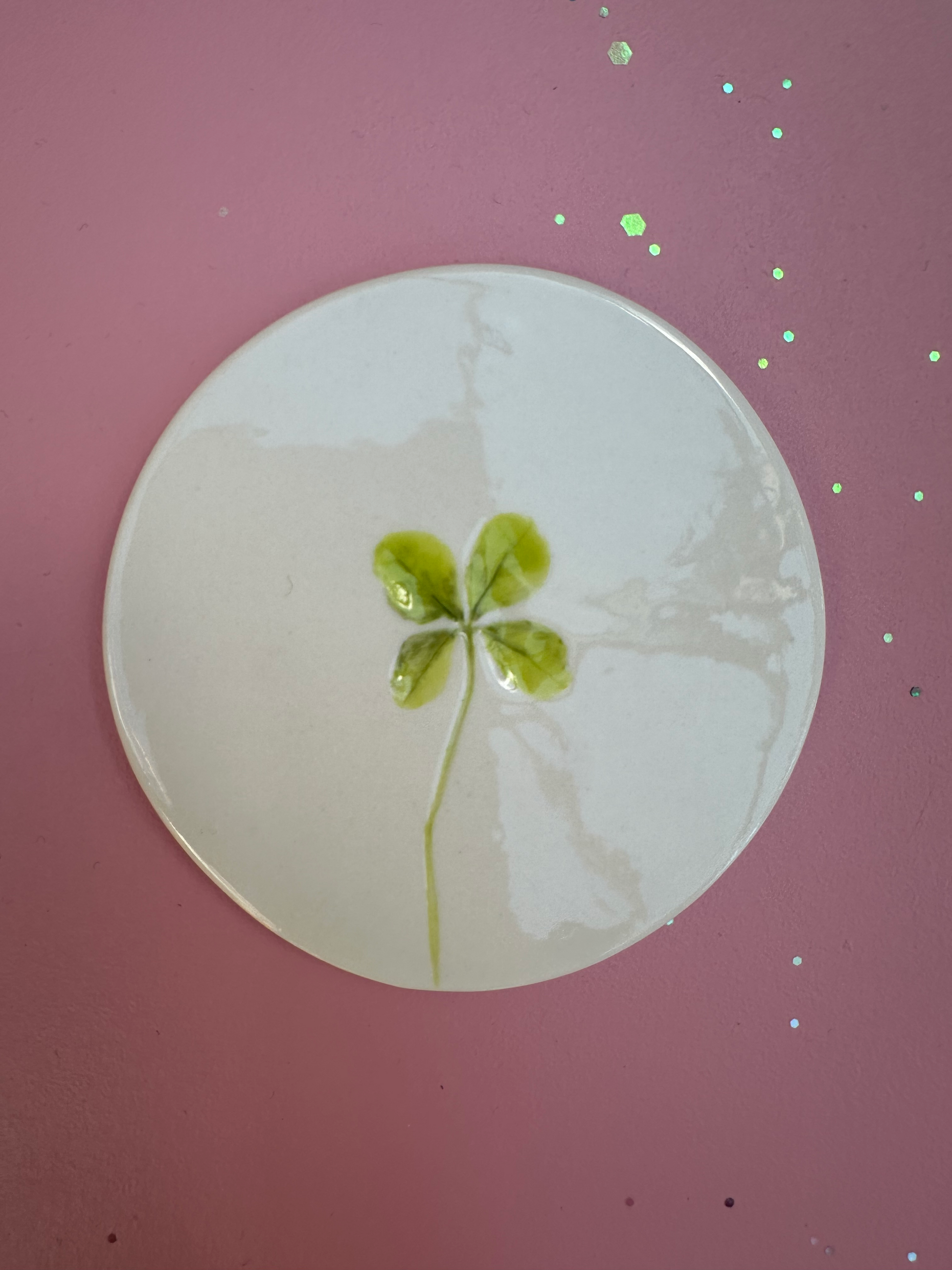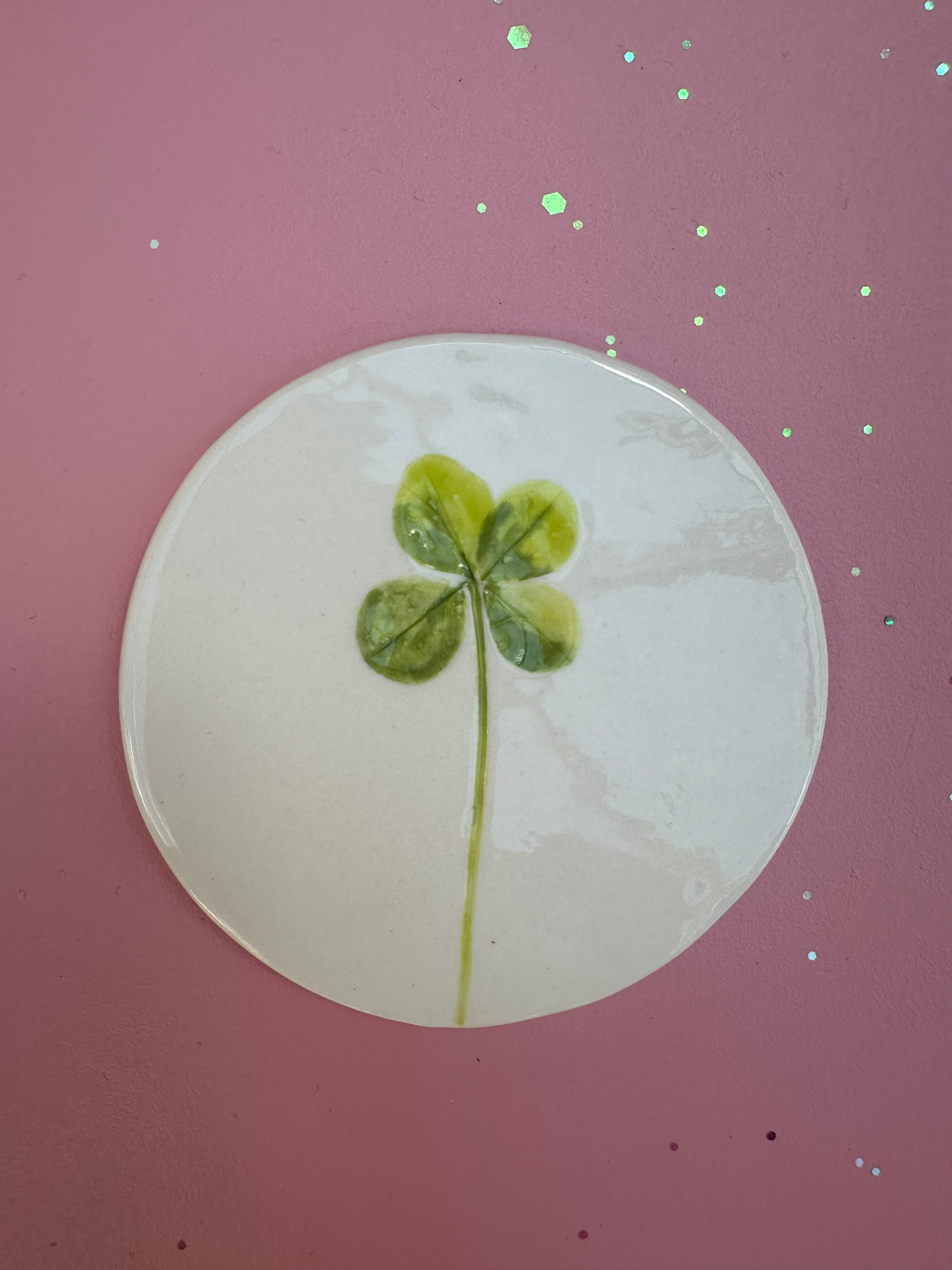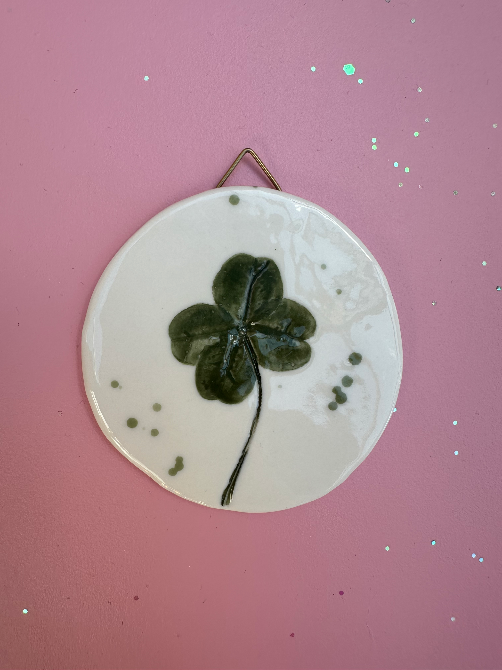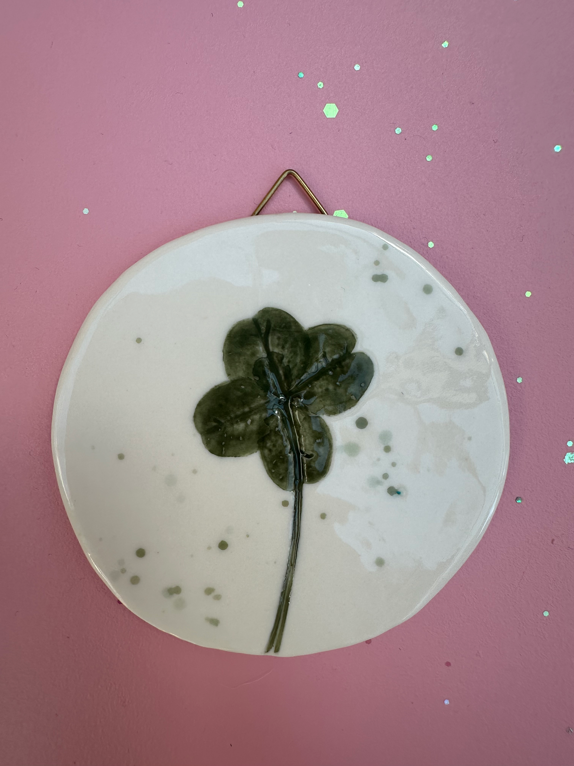 Kløver relief, der kan hænges op på væggen på et lille søm. Aftryk fra ægte 4-kløver og 5-kløver.