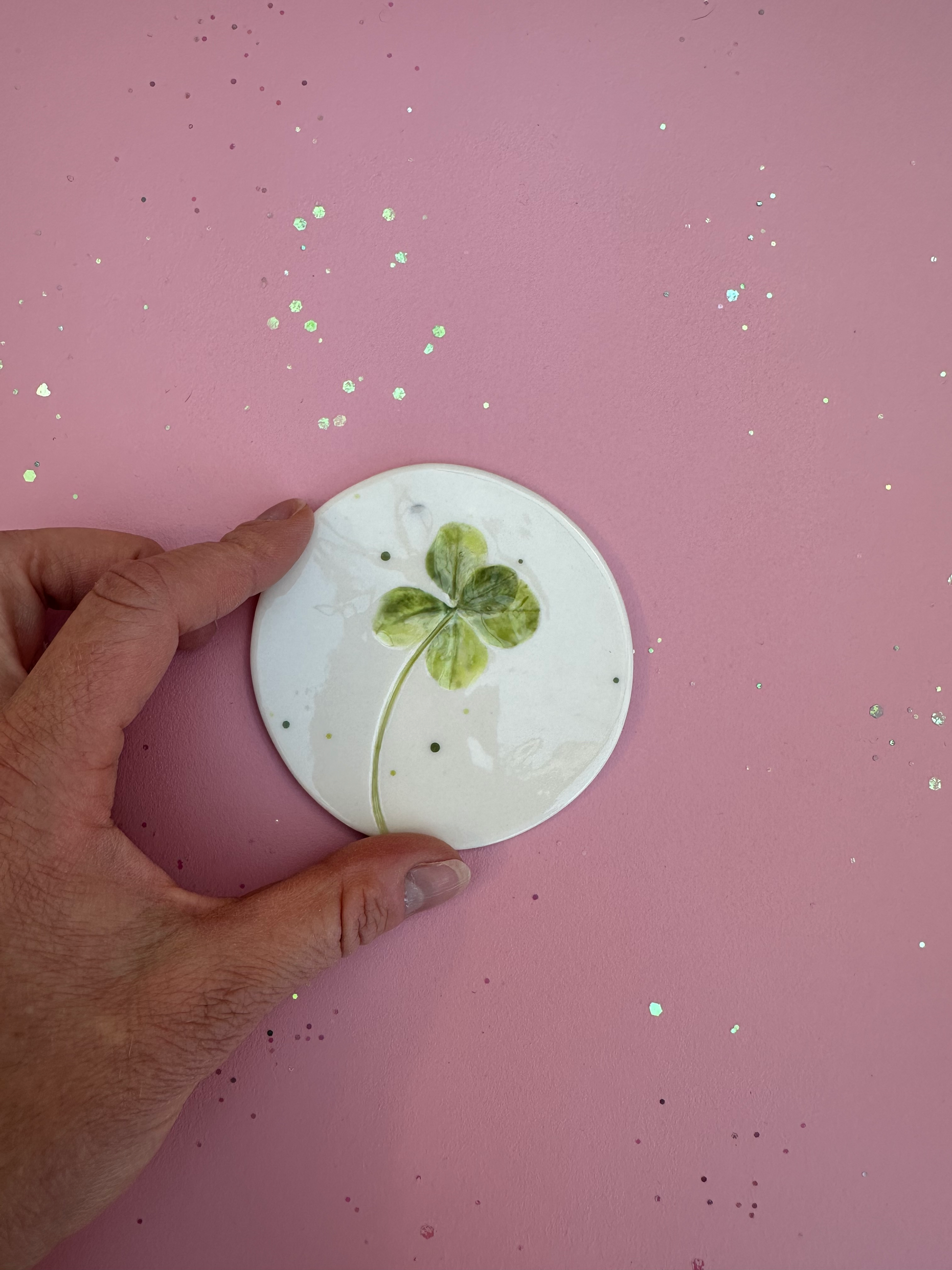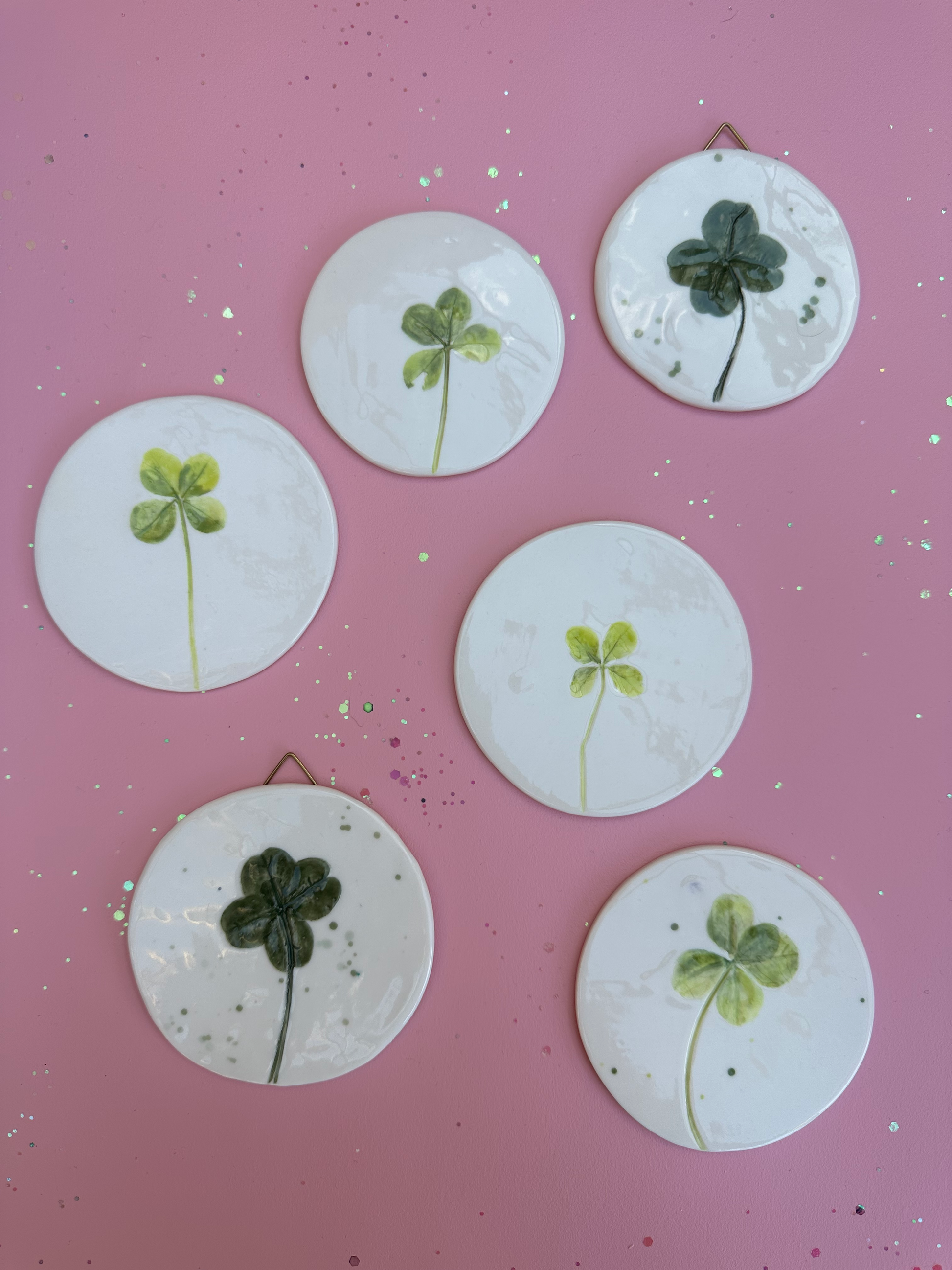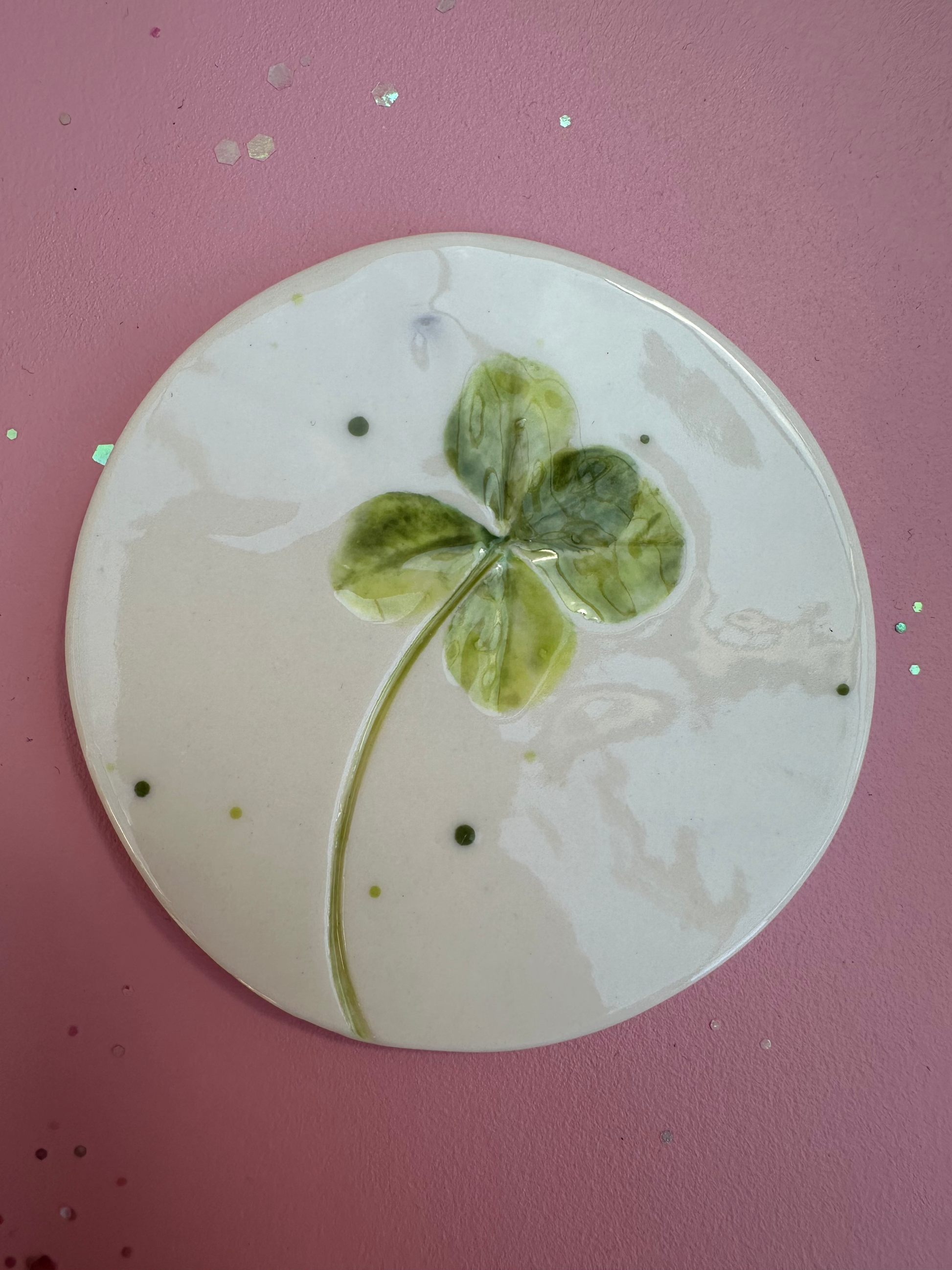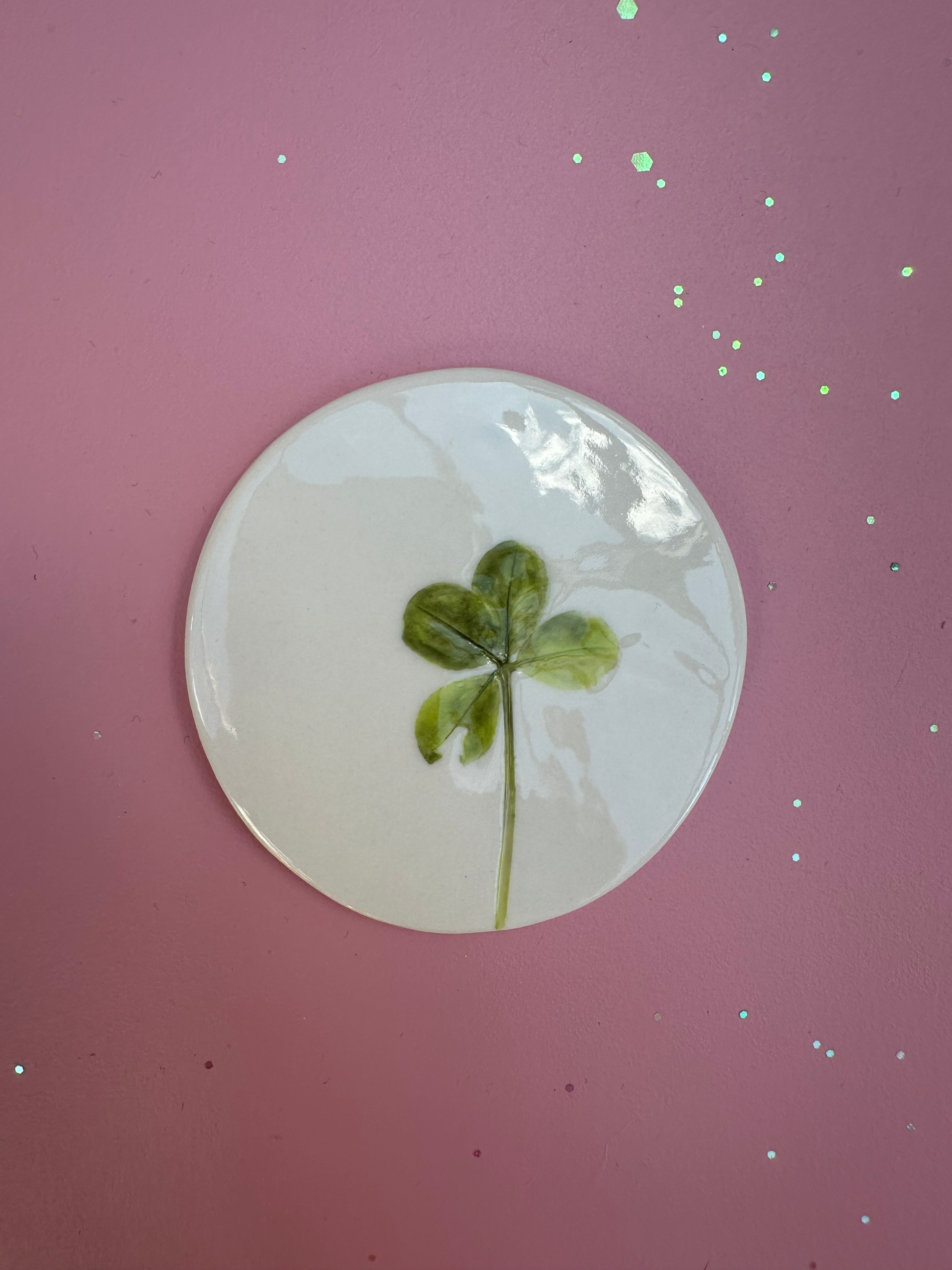Kløver relief, der kan hænges op på væggen på et lille søm. Aftryk fra ægte 4-kløver og 5-kløver.