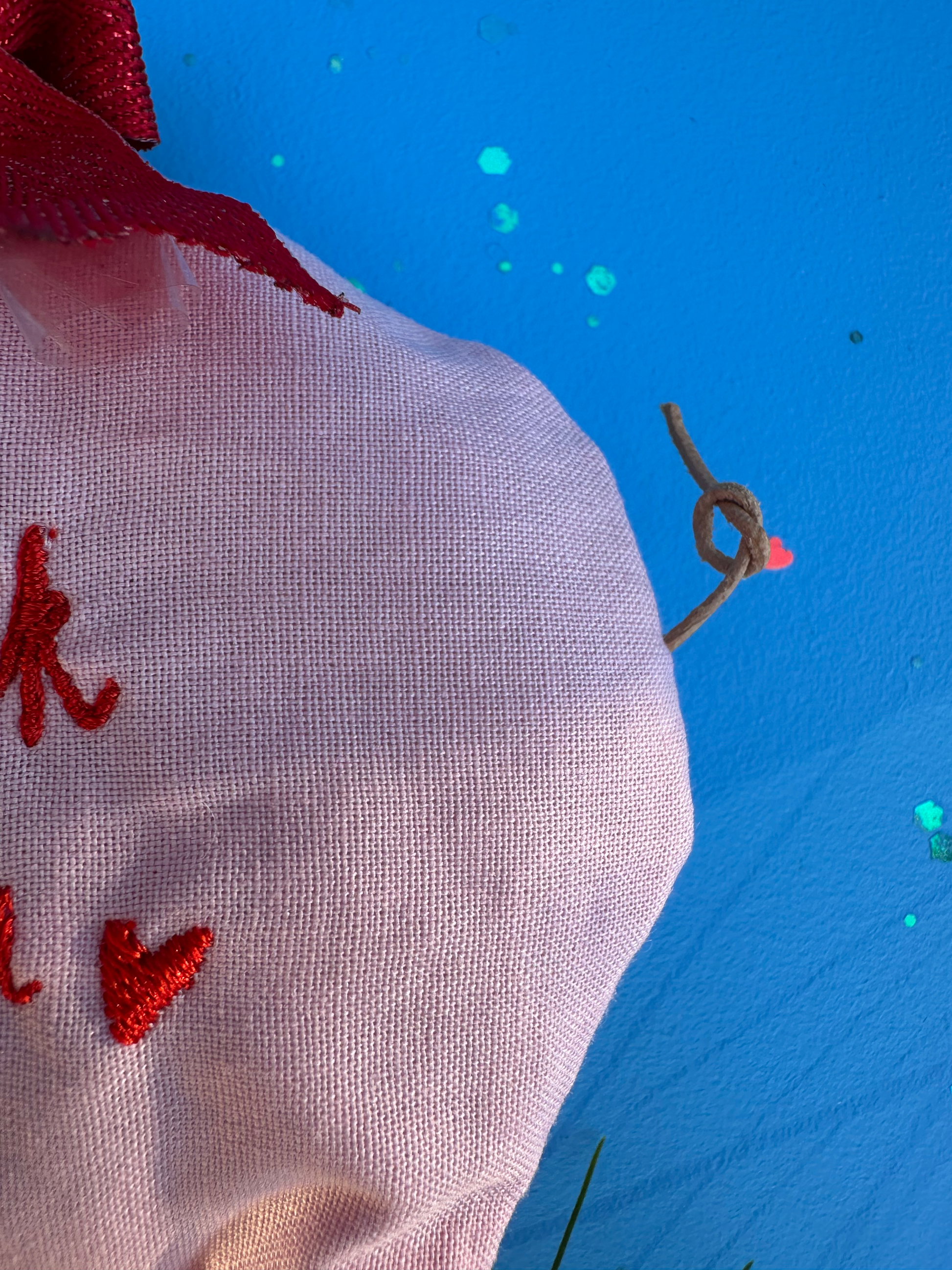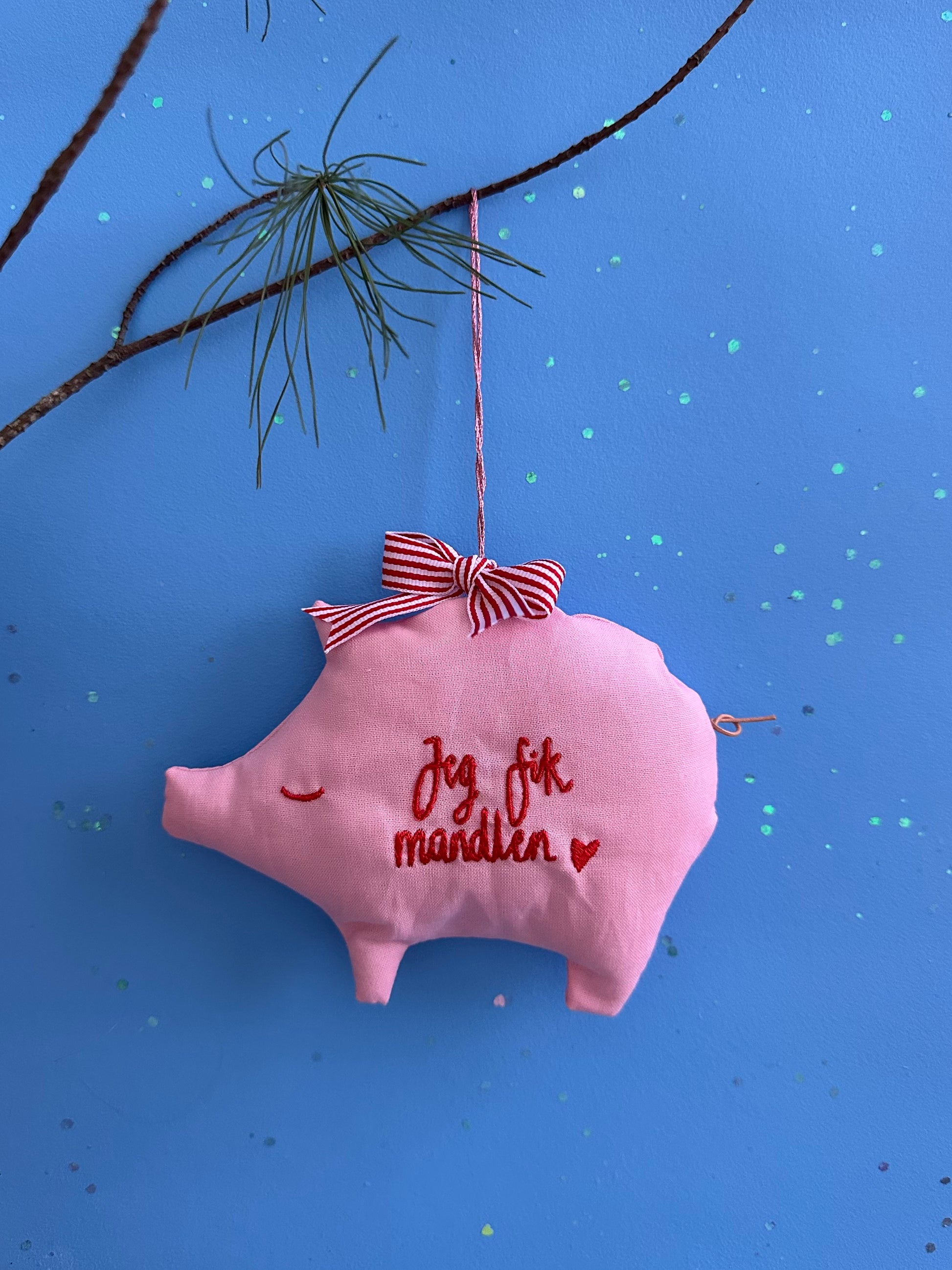 Sød julegris i stof med sløjfe, krølle på halen og broderet tekst: "Jeg fik mandlen."
