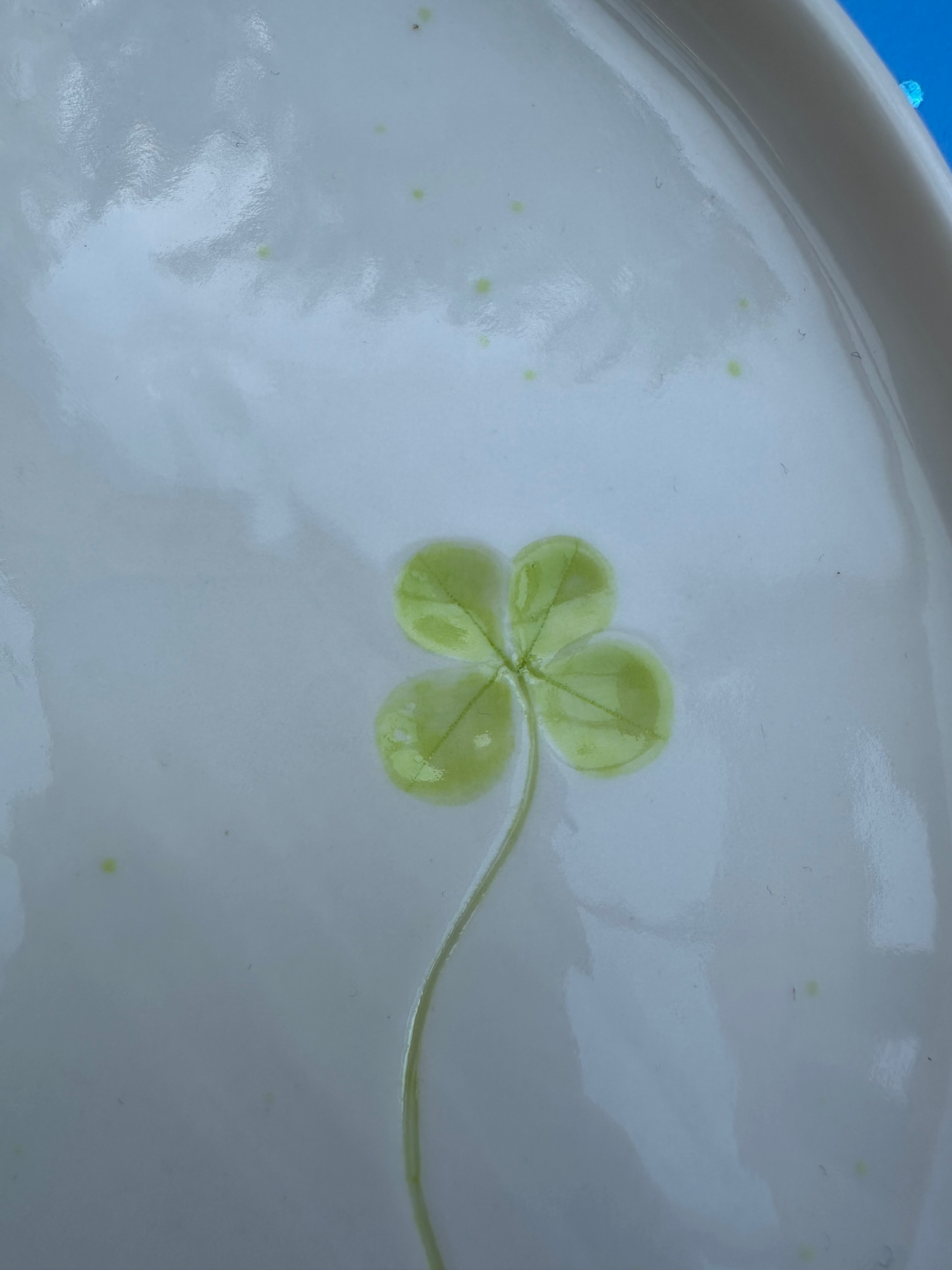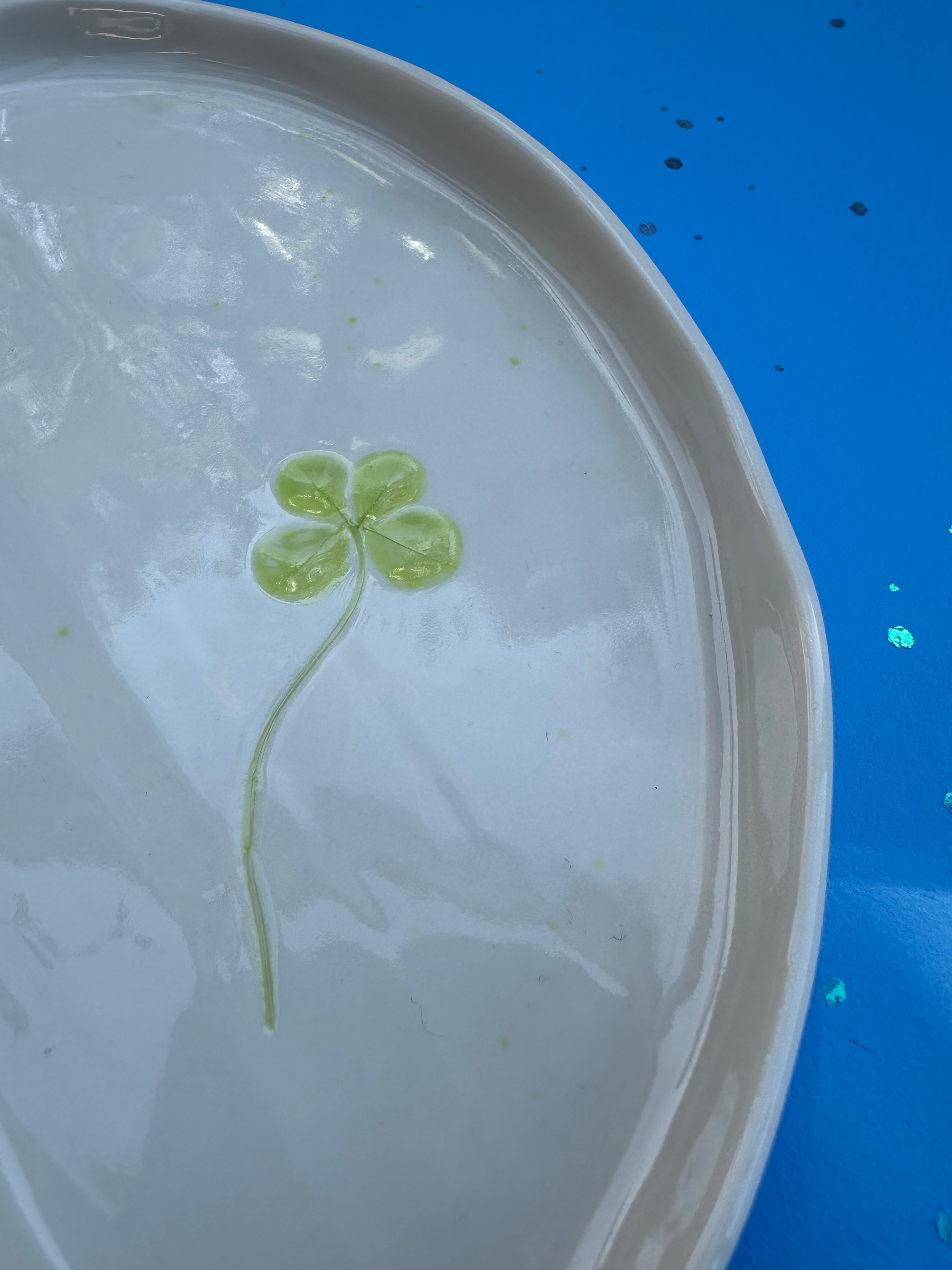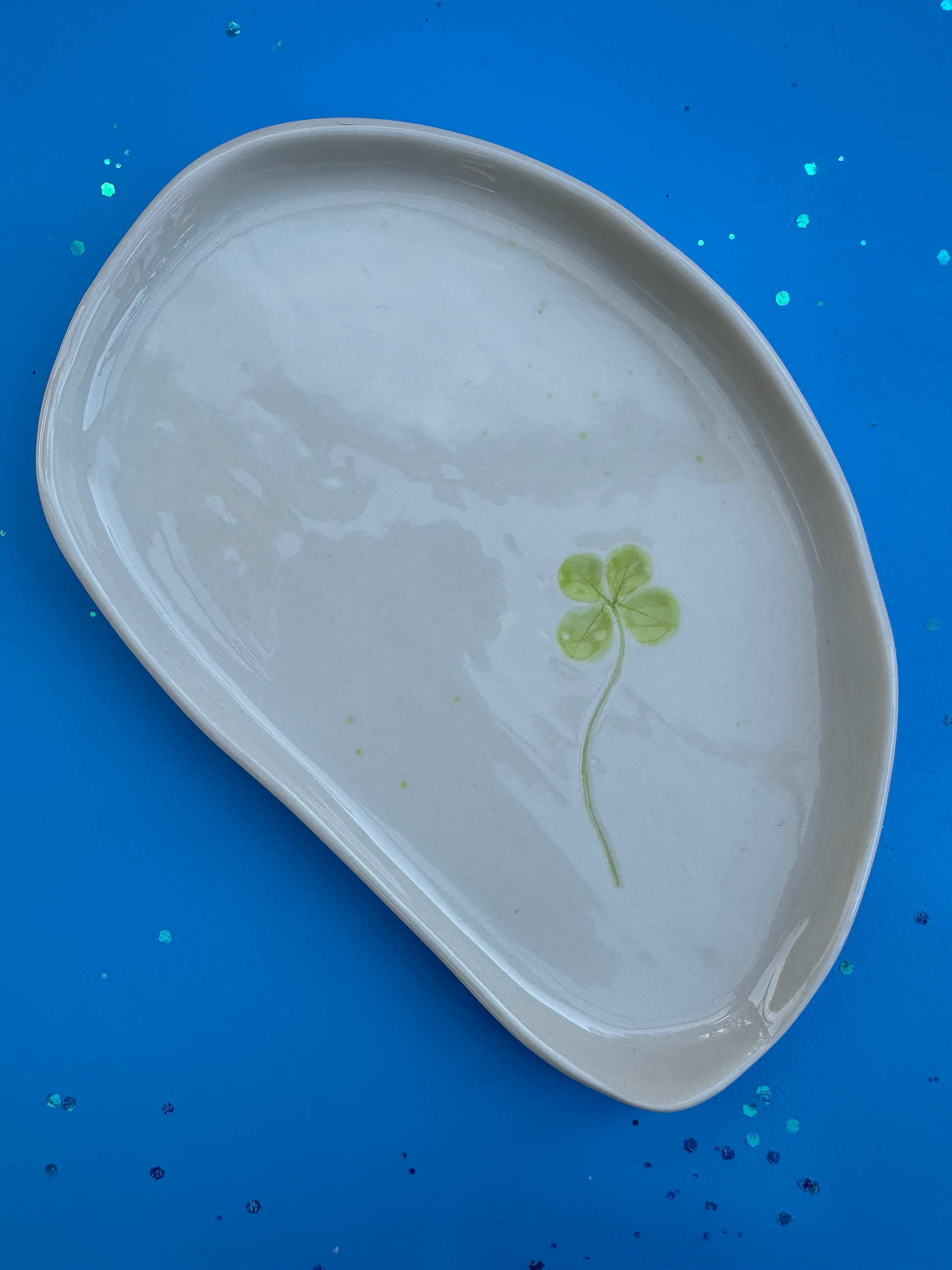 Hvidt porcelænsfad med aftryk fra et ægte firkløver, så derfor helt unikt. Fadet er formet i hånden og håndmalet.