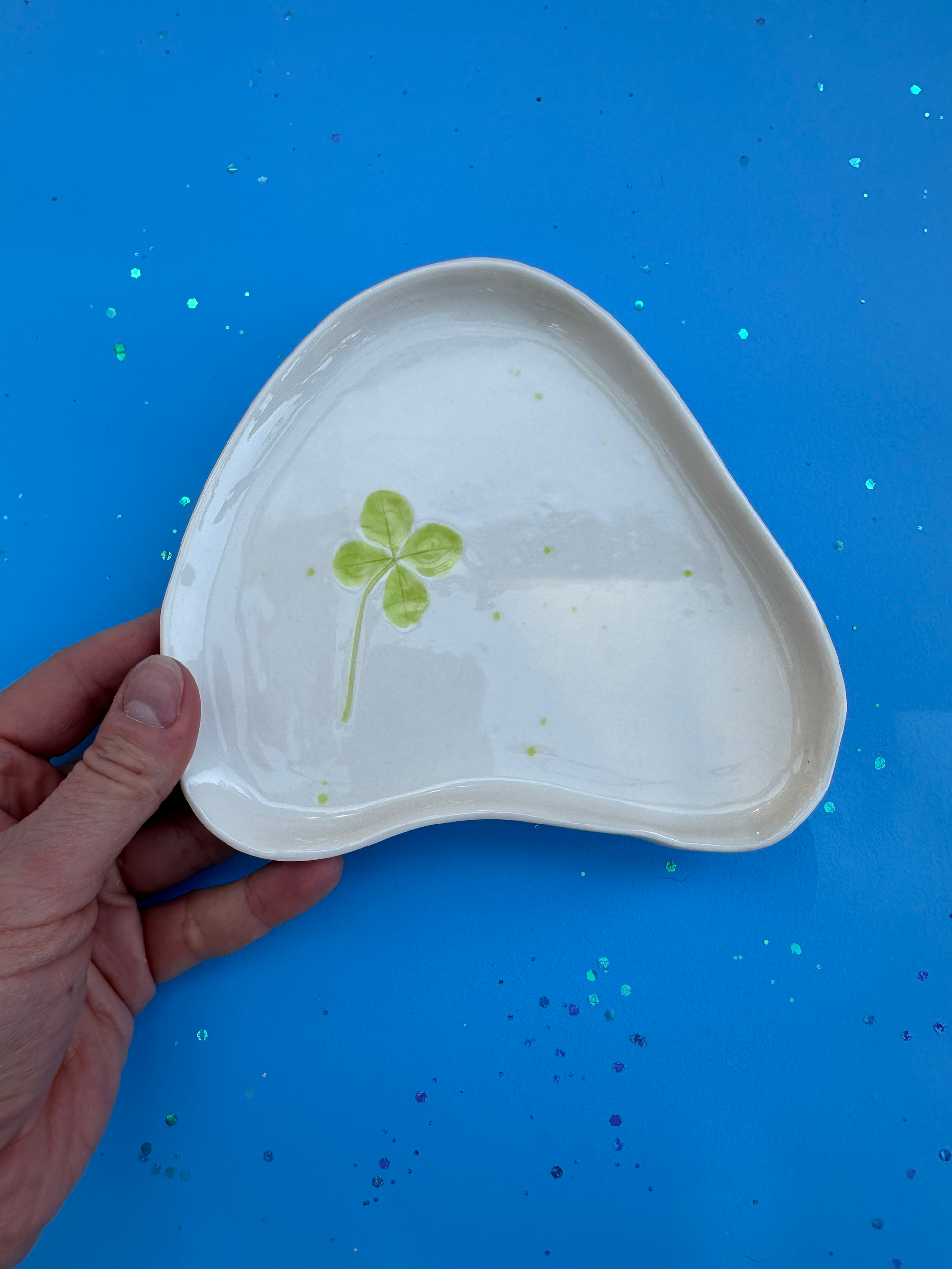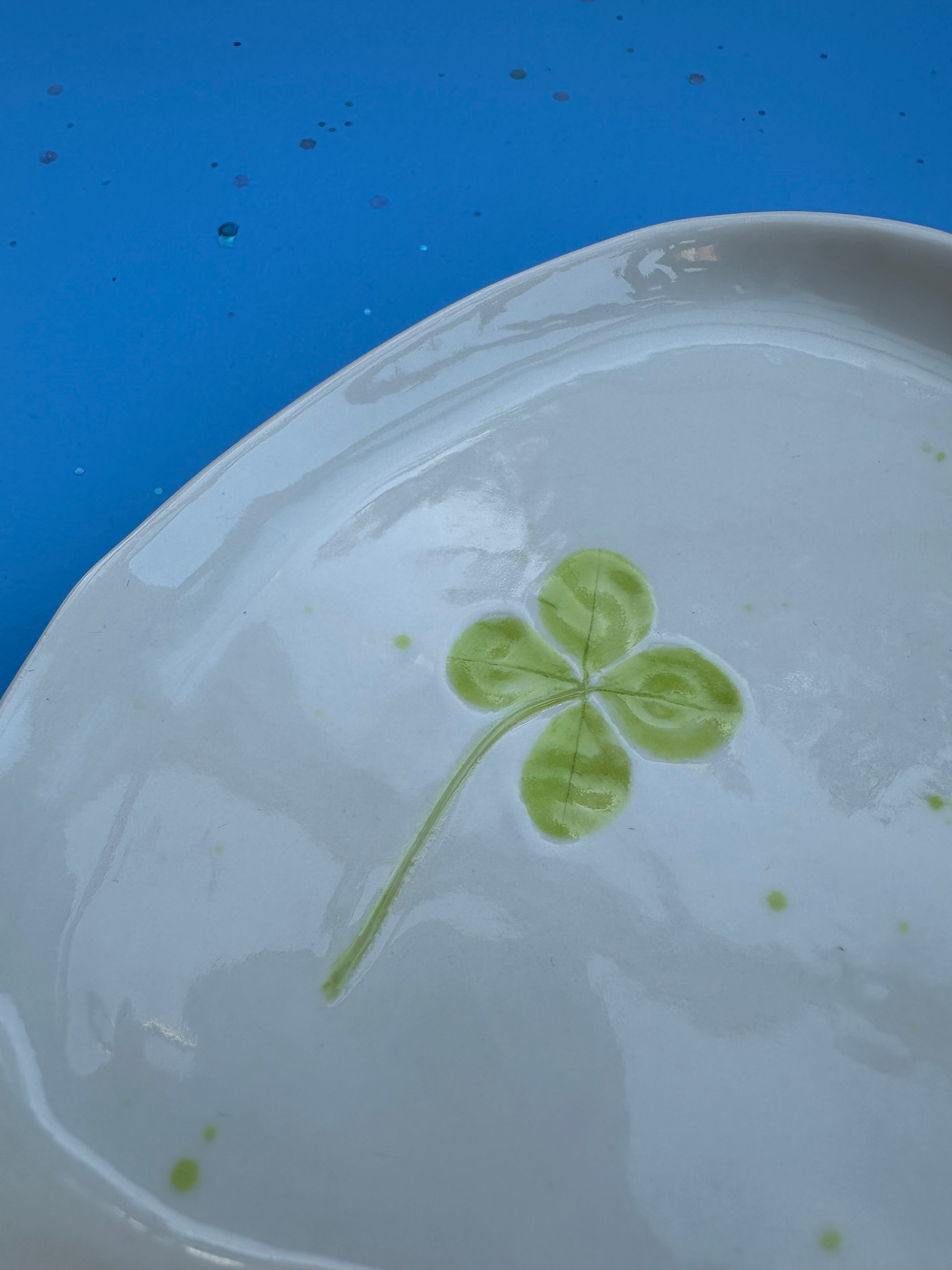 Hvidt porcelænsfad med aftryk fra et ægte firkløver, så derfor helt unikt. Fadet er formet i hånden og håndmalet.